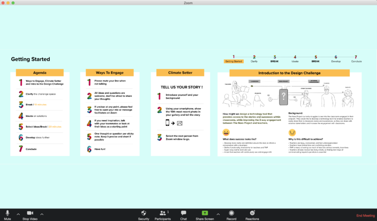 The Nora team successfully delivers year-long programming to over 50 schools. However, they struggle to engage busy teachers to gain access to the stories and interactions taking place inside the classrooms. Our team designed a 3-hour remote workshop and invited members of the Nora team and ID design students to explore the question: How might we design a technology tool that provides access to the stories and successes within classrooms while improving the 2-way engagement between The Nora Project and teachers?