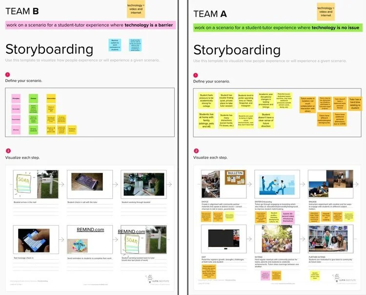 Throughout the workshop, we led participants through a series of activities using an online tool called Mural. We defined the problem space, ideated on solutions, and then developed the ideas into storyboards and specific concepts.